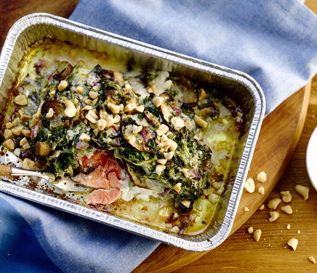 Décongeler les épinards, émincer le ½ oignon et mélanger le tout avec 60 g de beurre à l’ail et la crème fraîche/mozzarella dans un saladier. Couper les champignons en fines lamelles, couper ces lamelles en deux et les ajouter à la préparation à base d’épinards. Répartir uniformément cette préparation sur le pavé de saumon côté chair.