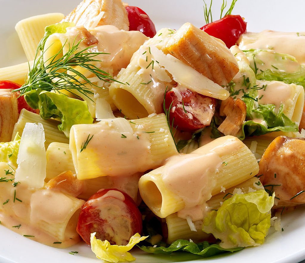 Remettre le poisson et les tomates dans la poêle. Laver l’aneth, l’égoutter, l’effeuiller et le hacher en gardant une partie pour garnir le plat. Égoutter les pâtes, les reverser dans la casserole avec la salade, l’aneth et la sauce au poisson et aux tomates. Mélanger rapidement et servir. Saupoudrer de copeaux de parmesan et garnir avec l’aneth.