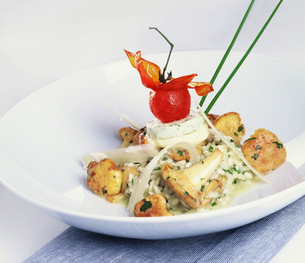 Éplucher et émincer l’échalote. Laver et nettoyer les girolles. Faire fondre le beurre à l’ail MEGGLE dans une poêle. Y faire revenir l’échalote émincée et les girolles et assaisonner légèrement avec du sel et du poivre. Ajouter le riz et déglacer au vin blanc.